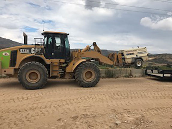 Loader putting equipment on a trailer. -
