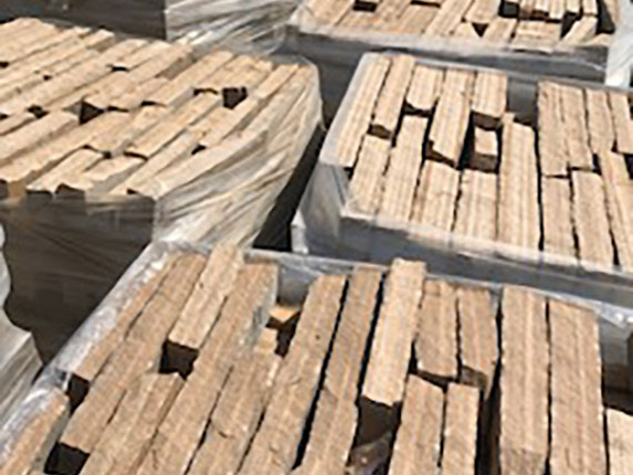 Cut stone stacked on pallets, ready to transport. -